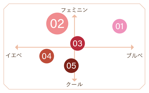 ティント:ジメチコン、水、(ジメチコン/ビニルジメチコン)クロスポリマー、マイカ、リンゴ酸ジイソステアリル、イソドデカン、セチルPEG/PPG-10/1ジメチコン、ポリメタクリル酸メチル、ポリメチルシルセスキオキサン、シクロペンタシロキサン、トリメチルシロキシケイ酸、セスキオレイン酸ソルビタン、ジステアルジモニウムヘクトライト、1,2-ヘキサンジオール、マイクロクリスタリンワックス、イソステアリン酸ソルビタン、(カプリル酸/カプリン酸)グリセリズ、ラウリルPEG-10トリス(トリメチルシロキシ)シリルエチルジメチコン、香料、炭酸プロピレン、トリエトキシカプリリルシラン、ジメチルシリル化シリカ、トコフェロール、カニナバラ果実油、ダマスクバラ花水、リモネン、リナロール、酸化チタン、酸化鉄、赤202、赤102