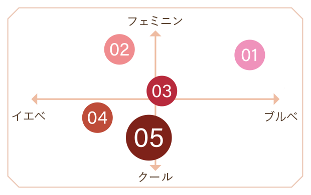 ティント:ジメチコン、水、(ジメチコン/ビニルジメチコン)クロスポリマー、マイカ、リンゴ酸ジイソステアリル、イソドデカン、セチルPEG/PPG-10/1ジメチコン、ポリメタクリル酸メチル、ポリメチルシルセスキオキサン、シクロペンタシロキサン、トリメチルシロキシケイ酸、セスキオレイン酸ソルビタン、ジステアルジモニウムヘクトライト、1,2-ヘキサンジオール、マイクロクリスタリンワックス、イソステアリン酸ソルビタン、(カプリル酸/カプリン酸)グリセリズ、ラウリルPEG-10トリス(トリメチルシロキシ)シリルエチルジメチコン、香料、炭酸プロピレン、トリエトキシカプリリルシラン、ジメチルシリル化シリカ、トコフェロール、カニナバラ果実油、ダマスクバラ花水、リモネン、リナロール、酸化鉄、黄5、赤202、赤102、青1